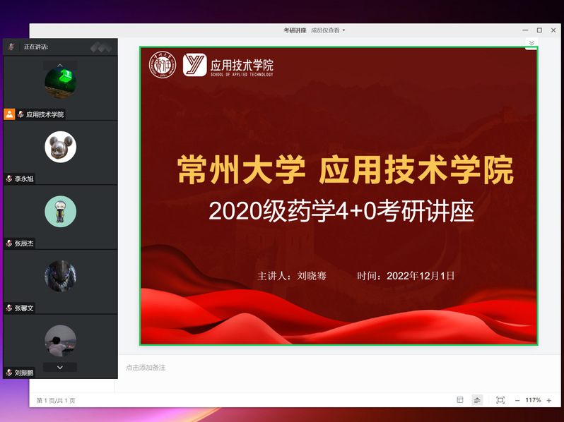 为加强学生考研认知,引导“4+0”联合培养项目学生树立合适的考研目标,12月1日,学院举办2020级药学“4+0”学生考研指导线上讲座。此次讲座由药学专业刘晓骞教授和药学专业负责人周舒文老师主讲,药学203班全体学生参加了讲座。