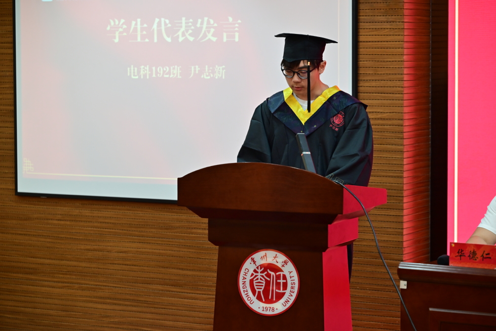 学生代表尹志新回顾了四年学习、生活的点点滴滴,表达了对母校和老师的不舍和感激之情。他表示未来一定能在自己的专业领域做出一番成绩,加强学习,不断超越,不辜负母校和恩师的培养与期望。