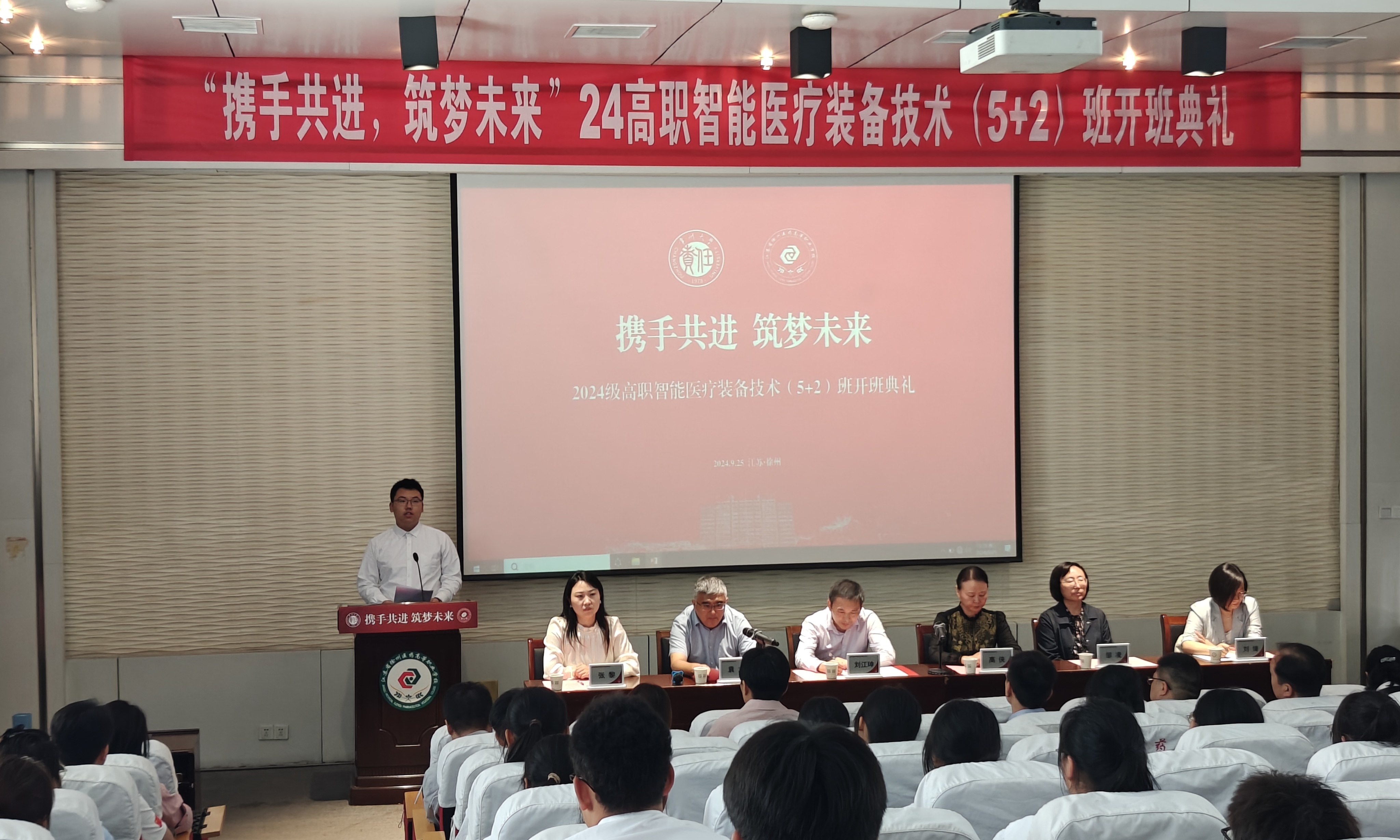 徐州医药高等职业学校党委书记高侠、副校长袁龙,教务处、教育督导室(发展规划处)、学生工作处相关领导、医疗器械系全体教师,我校医学与健康工程学院副院长邹凌和生物医学工程系主任周超,(5+2)班学生和部分家长参加本次典礼,开班典礼由袁龙主持。